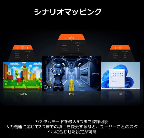 ここまで解説してきた、各画質モードのパラメータは、5つのユーザーメモリ(ALPHA/BRAVO/CHARLIE/DELTA/ECHO)に保存が可能となっている。このユーザーメモリ機能には、BenQ用語で「シナリオマッピング」という機能名称が与えられている。
