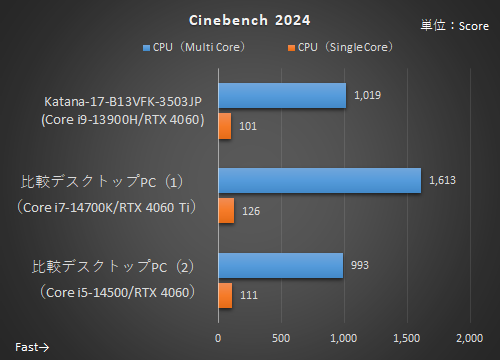 Katana-17-B13VFK-3503JPは、今回3モデルでもっとも高性能ということもあり、デスクトップPCからは「比較デスクトップPC(1)」、「比較デスクトップPC(2)」と比較する。なお、動作モードはMSI Centerで「究極のパフォーマンス」に設定している。これはほかの2モデルでも同様だ。まずは、CPUパワーを測定する「Cinebench 2024」と3Dベンチマークの定番「3DMark」の結果から見ていこう。