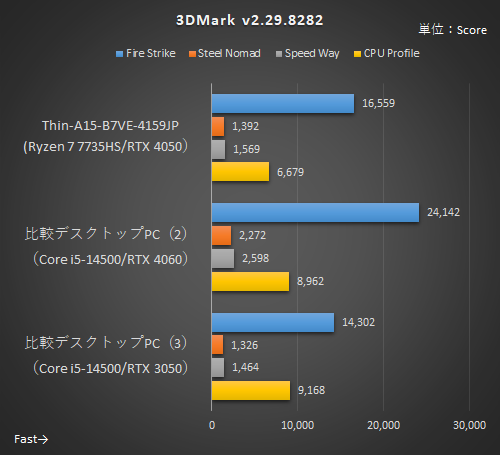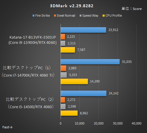 注目は「比較デスクトップPC(2)」とのスコアだろう。CPUは同じコア数、GPUもデスクトップ向けとノートPC向けの違いはあるものの同じRTX 4060ということもあってスコアはかなり近くなっている。“デスクトップPCのミドルレンジ構成に近い性能は持っている”と見てよいだろう。