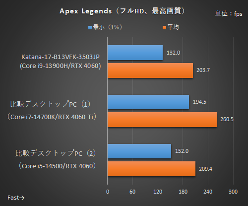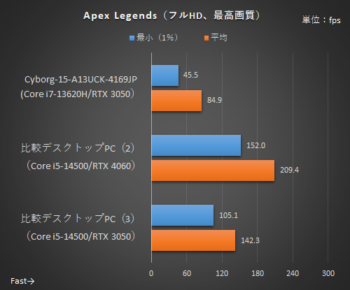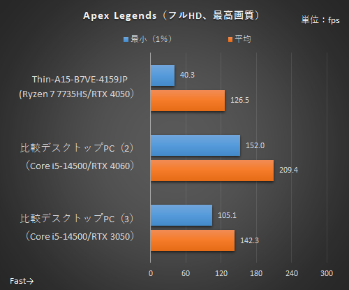 デスクトップ版のGeForce RTX 3050(8GB版)は世代的には古いがメモリバス幅は128bit、GeForce RTX 4050 Laptop GPUは最新世代だが96bitとバス幅が狭いのが影響したのか、Apex Legendsでは比較デスクトップPC(3)よりもフレームレートは下回った。それでも平均126.5fpsなので、144Hzのリフレッシュレートをかなり生かせるフレームレートは出ている。