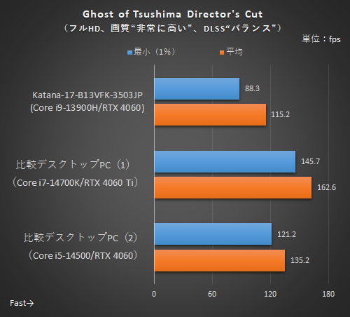 Ghost of Tsushima Director's Cutとサイバーパンク2077はアップスケーラー+フレーム生成でフレームレートを大幅にアップする「DLSS 3」に対応していることもあり、高画質設定でも快適に遊べるのがポイントだ。特にサイバーパンク2077でレイトレーシングを効かせても平均100.2fpsと高いフレームレートを出しているのはうれしいところ。