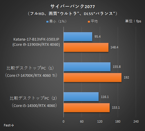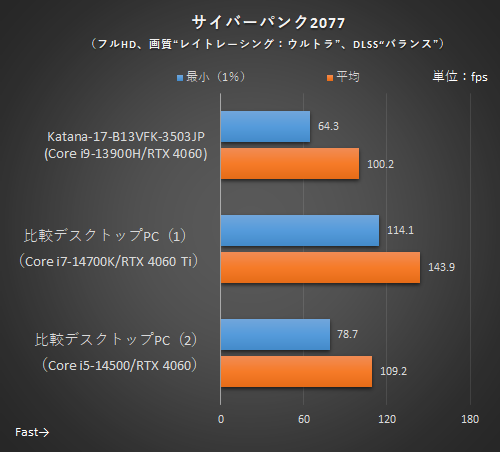 Ghost of Tsushima Director's Cutは、RTX 3050はFSRのフレーム生成を利用できるため、GeForce RTX 4050 Laptop GPUとよい勝負となった。その一方で、FSRのフレーム生成非対応のサイバーパンク2077では、RTX 3050はフレームレートを伸ばせず、Thin-A15-B7VE-4159JPが上回った。レイトレーシング有効時でも平均65.5fpsと快適に遊べるフレームレートを出している点に注目したい。