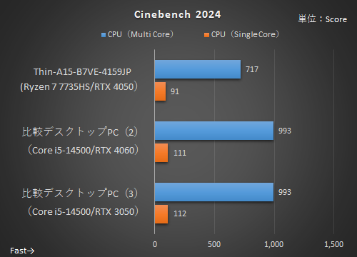 Thin A15 B7Vシリーズは、今回の3モデルで中間に位置する。デスクトップPCからは「比較デスクトップPC(2)」、「比較デスクトップPC(3)」と比較しよう。まず、「Cinebench 2024」と「3DMark」の結果から見ていこう。