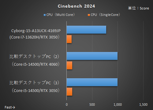 Cyborg 15 A13Uシリーズは、GPUのグレードで見れば今回一番下になる(CPUコア数はThin A15 B7Vシリーズのほうが少ない)。デスクトップPCからは「比較デスクトップPC(2)」、「比較デスクトップPC(3)」と比較しよう。まずは「Cinebench 2024」と「3DMark」の結果から。
