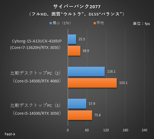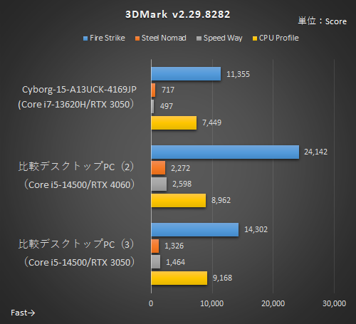 3DMarkを見ると、GPU性能の違いが如実に出る。比較デスクトップPC(3)はデスクトップ版のRTX 3050(8GB版)なので、GeForce RTX 3050 Laptop GPUよりもCUDAコア数もメモリ容量も多く性能差は大きい。その一方で、比較デスクトップPC(3)は高リフレッシュレートモニター採用の「プランB」との組み合わせで合計18万3,500円とCyborg 15 A13Uシリーズよりも4万円以上高くなる。導入コストには大きな差があるわけだ。
