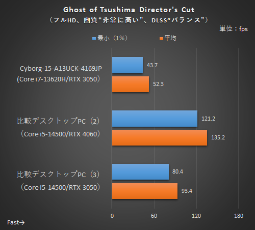 Apex Legendsは平均84.9fpsと十分快適にプレイできるフレームレートが出ている。144Hzのリフレッシュレートを生かしたければ、もう少し画質を落とすのがよいだろう。Ghost of Tsushima Director's Cutは、FSRによるフレーム生成を利用できることもあって、平均52.3fpsとプレイ可能なフレームレートを達成。人気ゲームを高い画質で楽しめる。
