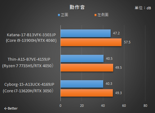 動作音はスペックの高いKatana-17-B13VFK-3503JPが一番高くなるのは仕方のないところ。ヘッドセットやヘッドフォンでゲームをプレイする人にはあまり関係ないだろう。そして、Thin-A15-B7VE-4159JPとCyborg-15-A13UCK-4169JPは動作音に関しては非常に優秀だ。
