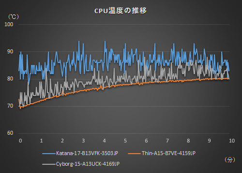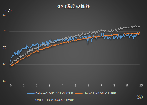 動作音は小さいほうがよい、という人はこの2モデルがオススメ。温度推移を見ると、ゲーミングノートPCで重要となるGPUの温度は3台とも緩やかな上昇でしっかりと冷却されている。特にThin-A15-B7VE-4159JPは、動作音が控えめでCPUも温度低め。3製品の中で一番軽い1.86kgとなっており、ノートPC的な“持ち運びやすさ”も含めたバランスのよさが光る結果だ。