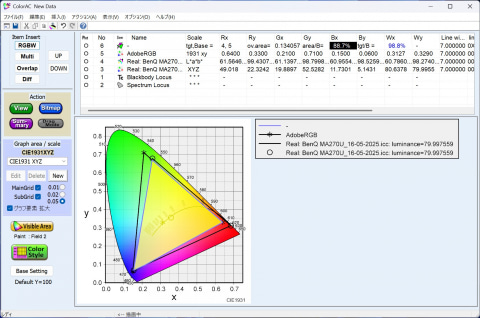Macとの色味の一貫性はすでに確認できているが、カラーキャリブレーション機器で色域を計測してみた。結果は、sRGBカバー率は99.8%、sRGB比は133.3%、AdobeRGBカバー率は88.7%、AdobeRGB比は98.8%、DCI-P3カバー率は96.3%、DCI-P3比は98.3%となった。公称ではDisplay P3カバー率95%、sRGBカバー率99%と謳われている。Display P3はDCI-P3をベースに作られたカラースペースで、両者には違いがあるが、MA270Uはカタログスペック通りの広色域を備えている。