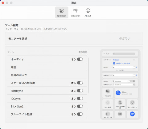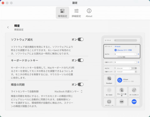 特に便利なのが「輝度の同期」と「キーボードホットキー」。輝度の同期を有効にすると、MacBookあるいはMA270U内蔵の環境光センサーを使って、すべてのモニターの輝度を自動同期できる。また、キーボードホットキーにより、MacBook本体の輝度調節キー操作で、MacBookの画面の明るさと連動して、MA270Uの輝度も調整されるのだ。つまり、色味だけでなく明るさもMacに自動で合わせられるということだ。