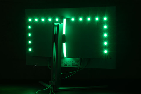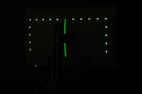 その一方で背面には複数のLEDが搭載されており、ライティングによる演出も楽しめるハデな一面もある。モニターとPCを付属のUSBケーブルで接続することで、Windows 11に搭載されている動的ライティング機能で発光色やパターンの制御ができ、別途ソフトをインストール不要なのが便利だ。
