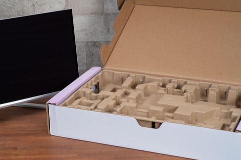 本製品はパネルのケア機能も備えているほか、5年間の長期保証も付いており、寿命の面でもかなり安心できるポイントだ。発砲スチロールを使わない100%リサイクル可能な再生段ボール紙を使った「省資源化パッケージ」も採用している。環境に優しいだけではなく、段ボール素材なのでコンパクトかつ取り出しやすく、スタンドの取り付けから設置までスムーズに行なえるのもありがたいところだ。