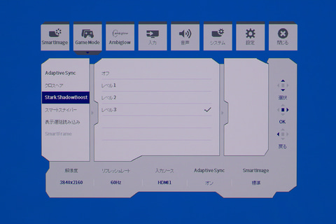 また、ゲーミングモニターでは定番と言えるゲーム内の暗部を見やすくする「スタークシャドウブースト」も搭載。明るい部分を明るくしすぎずに、暗いシーンだけを強調してくれるのが強みだ。3段階で強さを調整できる。