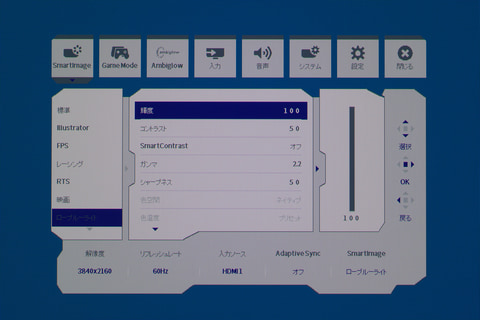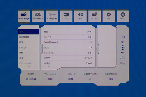 ゲームジャンルや目的別にプリセットを用意した「SmartImage」という機能も備える。「標準」「Illustrator」「FPS」「レーシング」「RTS」「映画」「ローブルーライト」「EasyRead」「エコ」が用意されており、たとえばFPSなら暗部が持ち上がる設定になる、といった具合だ。自分のカスタマイズ設定を保存できる「ゲーム1」「ゲーム2」というプリセットもある。目を休めたいときはブルーライトをカットするローブルーライトを選ぶとよいだろう。