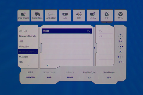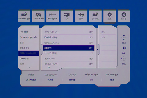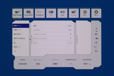 なお、「SmartImage」はHDRを有効化するとメニューが変化する。HDR利用時は画質関係を設定変更できなくなるモニターは多いが、本機は暗部を見やすくする「HDRゲーム」、映像向きの輝度とコントラストに調整する「HDRムービー」、赤、緑、青を強化する「HDR Vivid」をはじめ、「HDR Ture Black」「個人」「HDRピーク」「オフ」といったプリセットを用意。コンテンツや好みで調整できるようになっている。