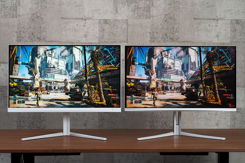 HDRを有効にした同じサイバーパンク2077の画面を見比べると、27M2N5501/11は液晶特有のバックライトによる“白っぽい黒”が出てしまう。一方の27M2N8800/11は、量子ドット有機ELによって高度な黒の表現が可能であるため、明暗のコントラストが際立つ。