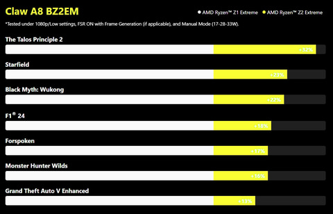 Claw A8の製品ページには、 Ryzen Z2 Extremeを搭載するClaw A8は、前世代Ryzen Z1 Extreme搭載機より13~32%性能が向上していると謳われている。