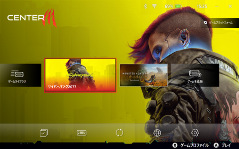 起動時にはゲームライブラリが並ぶホーム画面がまず表示され、下のアイコンからは「パフォーマンス設定」「操作設定」「新規機能と更新プログラム」「接続」「MSI Center Mの設定」にアクセスできる。