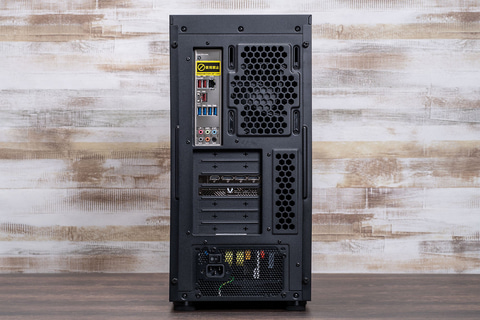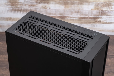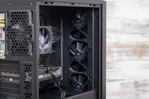 本製品は230×465×465mmというややコンパクトサイズのミドルタワー向けPCケースを採用しつつも、広大な内部空間を確保している。前面には140mmの大型ファンを3基、背面には120mmファンを1基標準搭載。さらに、大きな冷却口を設けた上面には、カスタマイズ購入時に120mmのファンを最大3基追加可能だ。