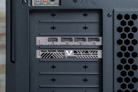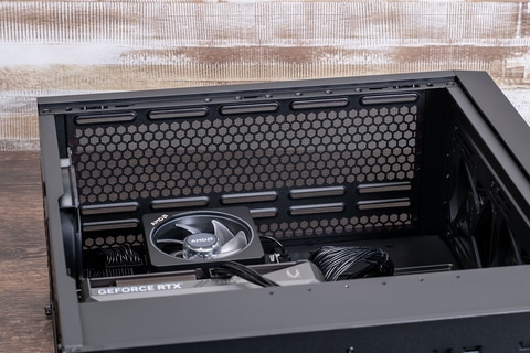 信頼性を担保するためになくてはならない装備がビデオカードホルダー。本ケースは最大410mmの大型ビデオカードを搭載可能で、標準装備されているビデオカードホルダーを利用すれば、移動時、輸送時のズレや脱落を防止できる。ハイエンドクラスのビデオカードは3kg近い。ビデオカードホルダーがないと、スロットや端子を損傷する可能性がある。現代のクリエイター向けデスクトップPCにおいて必須アイテムと言えよう。