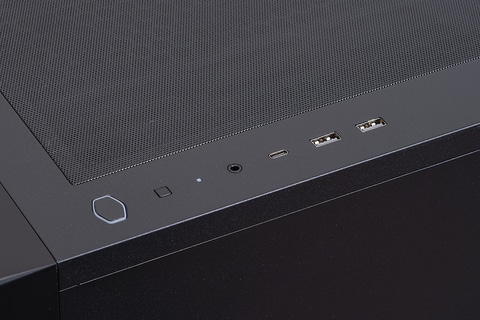 クリエイター向けPCにふさわしいシャープなイメージの前面パネルや、「SENSE∞」ロゴのデザイン性の高さも魅力。上面には電源スイッチ、リセットボタン、動作インジケーター、3.5mmコンボジャック、USB Type-C、USB Type-Aを装備。ヘッドセットや各種周辺機器を手軽に脱着できる。床の上に置いていても、椅子に座ったままで上面インターフェイスにアクセスできるのは、いま流行りの構成だ。