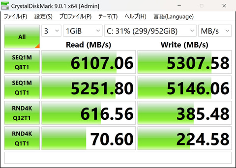 最後にパフォーマンスをチェックしておこう。CPUベンチマーク「CINEBENCH 2024」のCPU(Multi Core)は1,026pts、CPU(Single Core)は114pts。3Dベンチマーク「3DMark」のPort Royalは10,090、Time Spyは14,945、Fire Strikeは35,152、Wild Lifeは82,578。ストレージベンチマーク「CrystalDiskMark 9」のシーケンシャルリード(1M Q8T1)は6,107.06MB/sec、シーケンシャルライト(1M Q8T1)は5,307.58MB/sec。総合ベンチマーク「PCMark 10」の総合スコアは8,117、Essentialsは10,870、Productivityは8,330、Digital Content Creationは16,026となった。