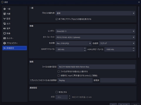 「録画」の「映像エンコーダ」で「(配信エンコーダを使用)」を選んでいる場合は、配信同様、録画もHDRで行なわれる。逆に、Twitch向けに配信はSDR(H.264)で行ない、録画の映像エンコーダとしてAV1かHEVCを選んで、録画のみHDRとすることもできる。
