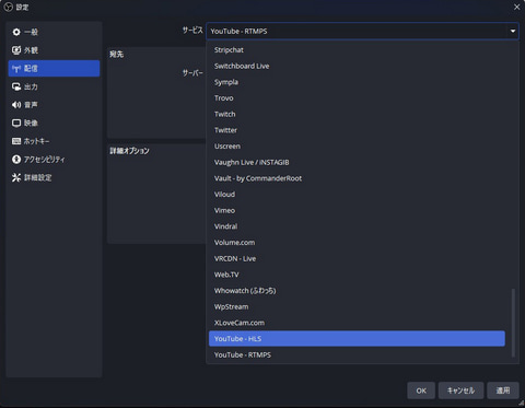 そして、YouTubeの配信サーバーもHDRに対応したものを選ぶ必要がある。「設定」→「配信」→「サービス」を選ぶと、YouTubeのサーバーとしては「YouTube - RTMPS」しか表示されないが、その下にある「すべて表示」をクリックすると、HDRに対応した「YouTube - HLS」を選べるようになる。