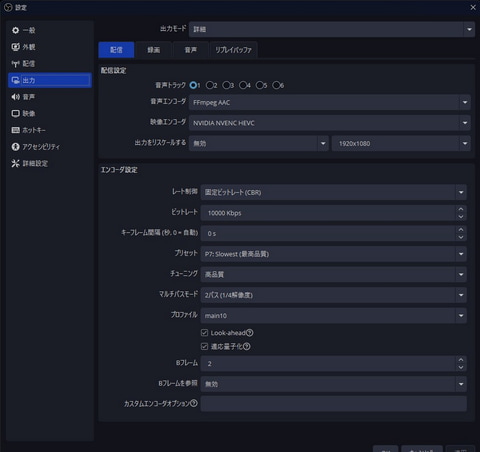 映像エンコーダもHDR対応のものを選ぶ必要がある。具体的には、標準のH.264ではなく、HEVC(H.265)かAV1なのだが、YouTube - HLSはAV1に対応していないので、HEVCのみが選択肢となる。OBSの「設定」→「出力」→「配信」→「映像エンコーダ」を「HEVC」に変更しよう。また、その下の「エンコーダ設定」の「プロファイル」を「main10」にする。なお、HEVCを扱えるのは、比較的新しい世代のGPUに限られる。
