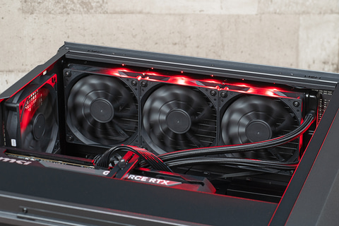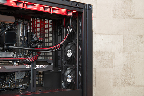 新型のオリジナル筐体もチェックしよう。前面はスリット構造で空気を取り込みやすくなっているのに加えて、3基の吸気ファンを備えており強力なエアフローを確保。天板には360mmクラスの簡易水冷クーラーを搭載し、背面には排気用のファンを1基備えている。天板、前面、右側面、底面にはダストフィルタが用意されており、内部へホコリが極力入らないようになっているのもポイントだ。