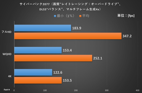 モンスターハンターワイルズはアップデートでDLSS 4のマルチフレーム生成に対応したこともあって、4Kの最高画質設定でも平均219.5fpsと高いフレームレートを出した。サイバーパンク2077もパストレーシングを有効にする強烈に描画負荷が高い設定だが、4Kで平均153.5fpsと滑らかな描画でプレイが可能だ。競技性が高いゲームもオープンワールド系のグラフィックス重視のゲームも、どちらも快適に楽しめるパワーがある。