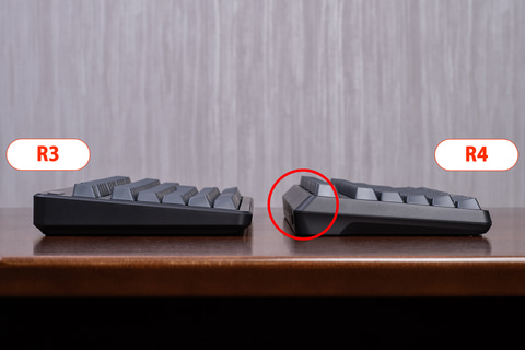 製品単体で見ると分かりにくいかもしれないが、R3と並べればはっきりとした違いに気付く。キーレイアウトは同一ではあるものの、前後左右のフレームの張り出しが抑えられ、狭額縁化していることが分かる。スペックシート上では幅が13mm、奥行きが16.5mmそれぞれ削減しており、明らかにコンパクトだ。
