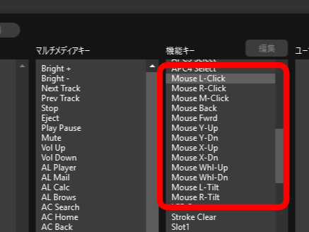 マウス操作できるようにするには、先ほど紹介したREALFORCE CONNECTの「キーマップ入替」で設定する。「キーマップ入替」では各キーに好きな機能を割り当てることができ、R4ではここでマウス関連の機能も割り当てられるようになっているのだ(R4以外では該当の機能が表示されない)。
