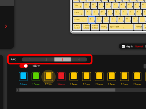 キースイッチはREALFORCEに一貫して採用されている独自の静電容量無接点方式で、これまで通り軽快かつ静音性の高いもの。キースイッチがオンになる位置を調節できるAPC(アクチュエーションポイントチェンジャー)機能は、0.8~3.0mmまで0.1mm刻みの22段階で設定でき、R3の4段階から5倍以上に細分化した。
