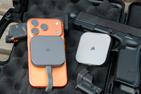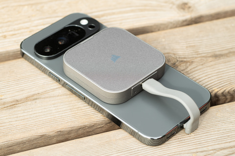 さて、今回試用しているのは、前述の通りCORSAIRのポータブルSSD「EX400U」だ。本製品の特徴の1つはMagSafeに対応していることだ。本体背面にMagSafe互換の磁気リングが内蔵されており、iPhoneや金属面に手軽かつ確実に固定できる。iPhoneでProRes撮影する際にもボディと一体化し、動画撮影時には直接本製品内のSSDに記録できる。