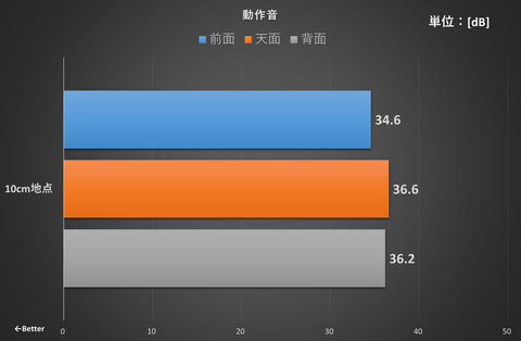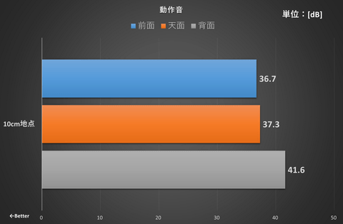 こちらも高負荷時(サイバーパンク2077をプレイ)の動作音をチェックした。同じく、前面、天面、背面のそれぞれ10cmの位置に騒音計を設置して測定している。