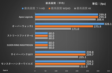 ではこちらも実ゲームでの性能をチェックしていこう。条件は「鉄板スターターセット」と同様だ。組み合わせるモニターが4K/144Hzなので、4K解像度でも高いフレームレートが出るのかに注目したい。