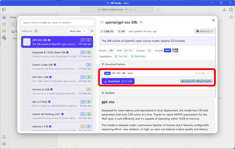 LM Studioでは、世にある数々のAIモデルの中から自分の目的に適したものを選べるようになっている。用途特化型の軽量なものから、汎用的な大容量のものまでそろっているが、ここでも「大容量=賢い」が基本だ。ただし、先ほど説明したようにVRAMに収まらないサイズだと、使うことはできても速度は大幅に低下する。