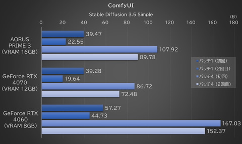というわけで、ここではAIモデルに「Stable Diffusion 3.5 Simple」を使い、一定のプロンプトで画像生成したときにかかった時間を比較してみよう。AIモデルの全読み込みが発生する初回と、部分的に読み込みが発生する2回目のどちらも計測している。
