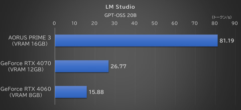 「トークン/s」というのはAIの処理単位のことで、値が大きいほど高速に処理できることを意味する。VRAM 16GBであるAORUS PRIME 3の約81トークン/sに対し、VRAM 8GBのPCは5分の1以下の約16トークン/sと比較にならない差だ。世代が異なるとはいえ、GPUのグレードとしては格上のはずのGeForce RTX 4070(12GB)でさえも3分の1以下の速度となっている。