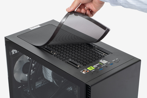 「THIRDWAVE AD-R7X56A-01B 輝く水冷モデル」は、すっきりとしたフロントフェイスにガラスサイドパネルが組み合わされ、3つ以上のLED付き冷却ファンが内部を照らし出す、本格感あるゲーミングスタイルのミニタワーデスクトップPC。底面と天面には脱着の容易なマグネット式ダストフィルターが装着されており、メンテナンス性にも配慮している。