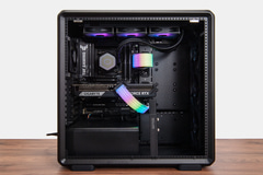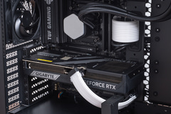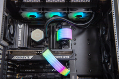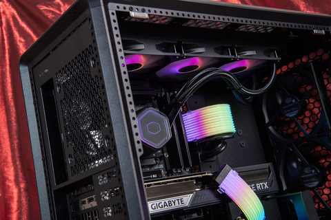 PCケースのMasterFrame 600は、Extended ATXサイズのマザーボードに対応するだけあって、531×261×544mm(突起物を含む)とかなり大型だ。それだけにハイエンド構成でも内部にはかなりゆとりがあり、メッシュ構造と相まって高い冷却力を確保している。左サイドパネルは透明度の高いガラスで内部の様子をしっかり見えるのもポイント。今回の構成では、ビデオカードの補助電源とメインパワー電源ケーブルにARGB内蔵のカバーを追加、CPUクーラーのCooler Master MasterLiquid 360 Core IIの水冷ヘッドとファンにもARGBが内蔵されているため、かなりハデな演出も楽しめる。