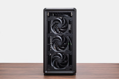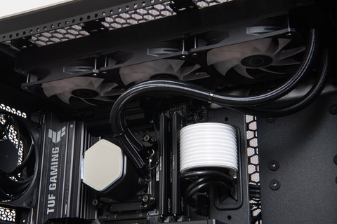 高い冷却力も確保されている、簡易水冷クーラーには360mmクラスと大型のMasterLiquid 360 Core IIを採用、前面には140mmファンが3基、背面には120mmファンが1基備わっており、前面から吸気して天面と背面から排気する強力なエアフローを形成している。
