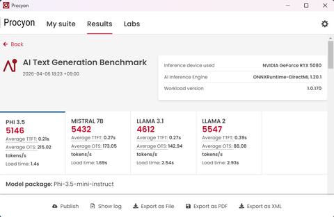 また、ローカルLLM性能のテストとして「Procyon AI Text Generation Benchmark」を実行してみよう。パラメータ数が異なる複数のモデルを実行し、生成速度からスコアを算出するテストだ。