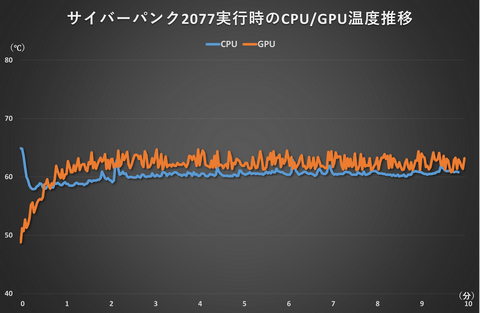 その一方で、CPUとGPUの両方に負荷がかかるサイバーパンク2077はCPUが平均60.3℃、GPUが平均61.8℃とどちらもしっかり冷えている。