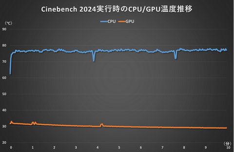 Cinebench 2026はCPUの全コアに負荷がかかり、GPUは使わないテストだ。そのためGPU温度はまったく上がっていない。CPU温度は平均76.6℃と高クロックでフル稼働しても十分低いといえる温度だ。動作音については、簡易水冷クーラーのファンの回転数が上がるため、やや大きくなる。