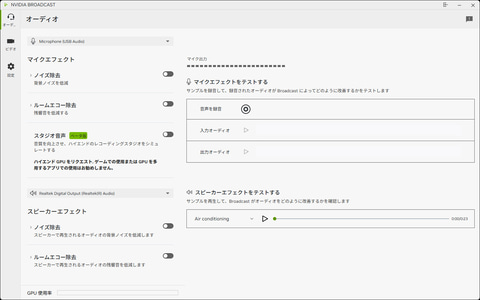 先ほどのマイクエフェクトは、NVIDIA Broadcastを活用している人なら当たり前に知っている機能だと思う。が、マイクだけでなくスピーカーで再生される相手の音声までノイズ低減できるというのは、意外と知らなかった人もいるのではないだろうか。