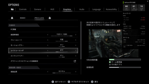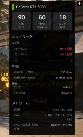 ゲーム内は90fps、ストリーミングはほぼ60fps、PINGは15ms前後で、プレイは快適そのものだった。フレームロスやパケットロスもゼロではなかったが、プレイに支障はなかった。レイトレーシングも有効になっており、旧型のノートPCでこれだけの美しい描画を体験できるのはうれしいところだ。