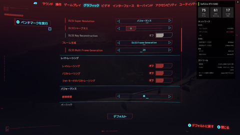 まずはオープンワールドRPGとしてサイバーパンク2077をプレイしよう。解像度やフレームレートについては「設定」→「ゲームプレイ」→「ストリーミング品質」の項目で設定する。今回の環境ではデフォルトの「バランス」では、フルHD/60fpsに設定された。これをカスタムにすることで、4K解像度や360fpsといった設定を行なえる。
