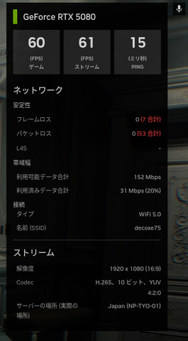 ゲーム内の画質については設定した解像度やフレームレートに合わせて自動的に調整される。手動で変更も可能だが、自動設定される画質のままでプレイした方が安定する。というわけで、まずはストリーミング品質はデフォルトのバランス(フルHD/60fps)でプレイした。